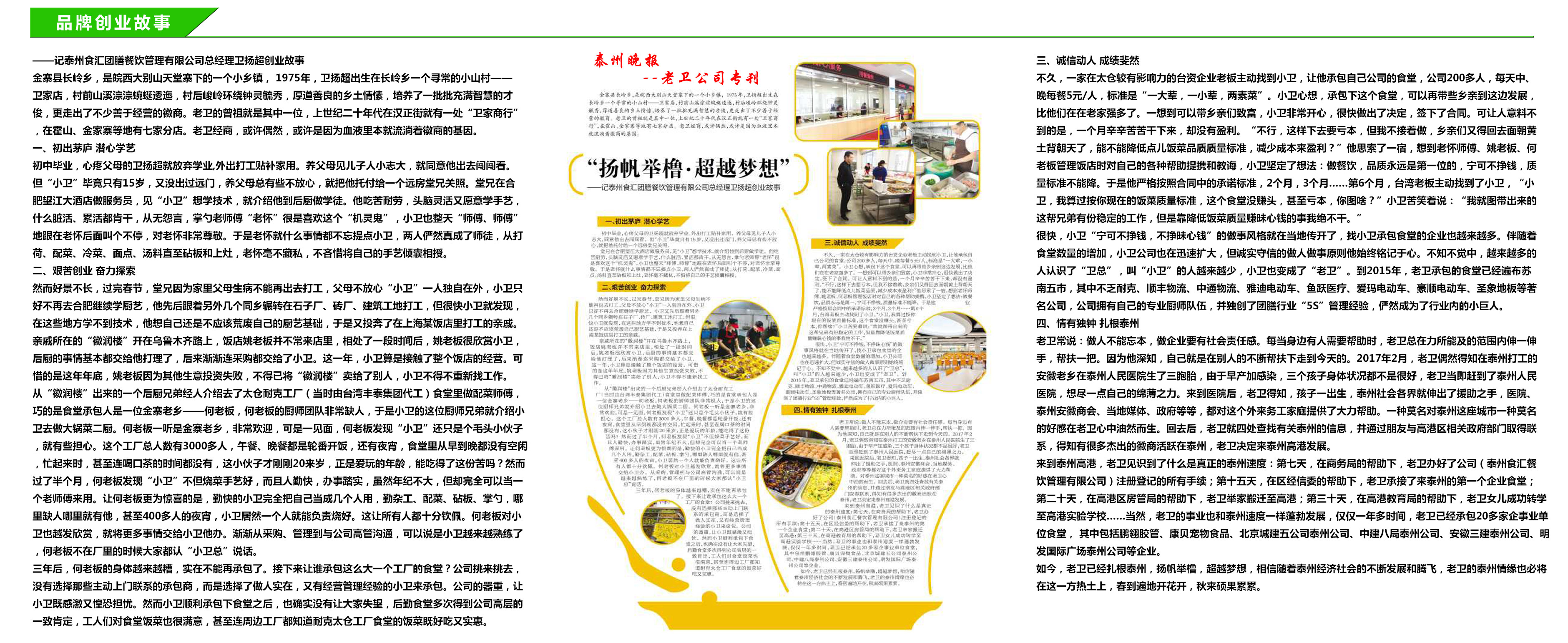 泰州食匯團(tuán)善餐飲管理有限公司有近十年企事業(yè)食堂承包經(jīng)驗(yàn),一直致力于打造從田園到餐廳,集基地管理、主輔食材批發(fā)配送、提供團(tuán)膳服務(wù)(食堂承包或托管)、餐飲連鎖管理為一體的大型專(zhuān)業(yè)團(tuán)膳餐飲管理集團(tuán)企業(yè)。公司創(chuàng)始人衛(wèi)揚(yáng)超先生是業(yè)內(nèi)人士,從事餐飲管理行業(yè)近十五年,先后承包、管理運(yùn)營(yíng)過(guò)上海、太倉(cāng)、昆山、蘇州、無(wú)錫、常州、鎮(zhèn)江、泰州、南通、淮安、合肥等地共計(jì)200余家企事業(yè)單位(其中有上市公司、高等院校及世界500強(qiáng)企業(yè))的食堂。在不斷的發(fā)展過(guò)程中,公司廣攬烹飪?nèi)瞬偶捌髽I(yè)管理人才,加大了對(duì)自身隊(duì)伍的建設(shè),培養(yǎng)和儲(chǔ)備了一大批的管理、技術(shù)人才,泰州食堂承包為公司的穩(wěn)健發(fā)展奠定了堅(jiān)實(shí)的基礎(chǔ)。